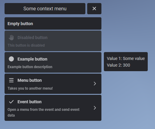 menudoes, useful when you are opening a menu from an event. Can be set to false to hide it.